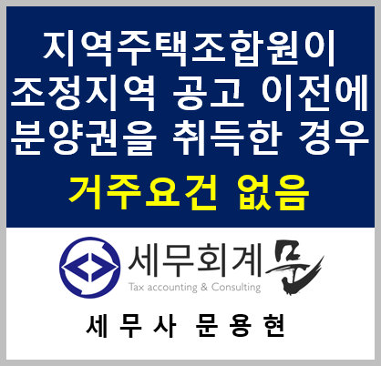 귀 서면질의의 경우,「주택법」제2조제11호가목에 따른 지역주택조합의 조합원의 지위를 보유한 세대가 조정대상지역 지정 이전에 분양권 매매계약을 체결하고 계약금을 지급한 사실이 증빙서류에 의하여 확인되는 경우에는 그 분양권이 완공되어 해당주택 양도시 1세대 1주택 비과세 거주요건을 적용하지 아니하는 것입니다.