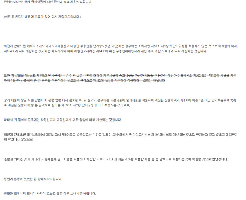 아래 비교과세 단기세율 적용에 관한 질의회신에 대한 답변이 나왔습니다.