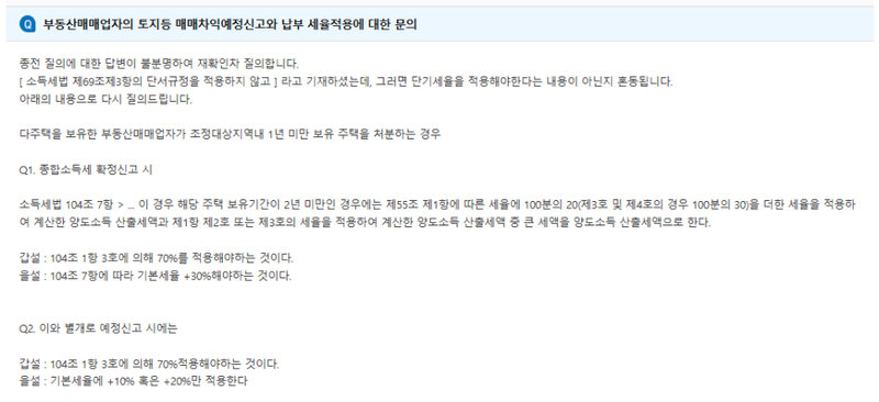 단기세율인 70%, 60%가 적용되는지에 대한 부분인데 이번 질의 회신을 통해 적용되는 것으로 보입니다.