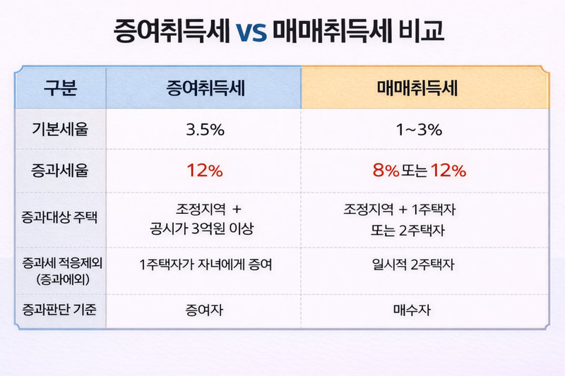 ① 증여취득세는 조정지역에 소재하면서 공시가격 3억원 이상인 주택이면 무려 12%의 중과세율을 부과하지만, 부모님이 1주택자라면 3.5%의 기본세율이 적용됩니다.