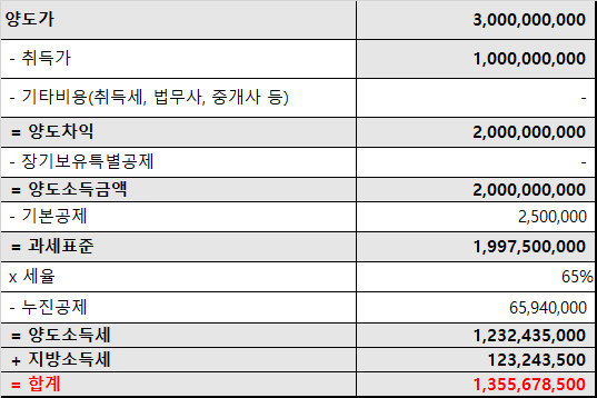 양도가 30억, 취득가 10억, 보유기간 15년 이상을 가정할 경우,