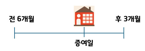 증여세의 경우 증여일 기준 '6개월 전' ~ '직후 3개월 이내'
