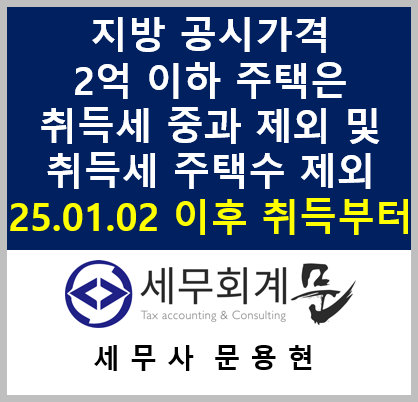 ➜ 2025년 1월 2일 이후 취득 하는 공시가격 2억 원 이하 주택은 취득세 중과 제외뿐만 아니라 이후 신규 주택 구입에 따른 취득세 산정 시 보유 주택 수에서도 제외되며,