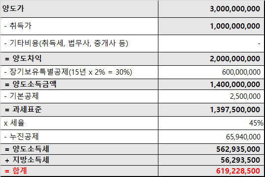 양도가 30억, 취득가 10억, 보유기간 15년 이상을 가정할 경우,