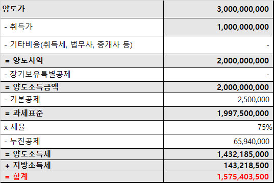 3) 3주택 이상 중과세율(+30% 중과 , 장기보유특별공제 불가) : 약 15억 7,500만원
